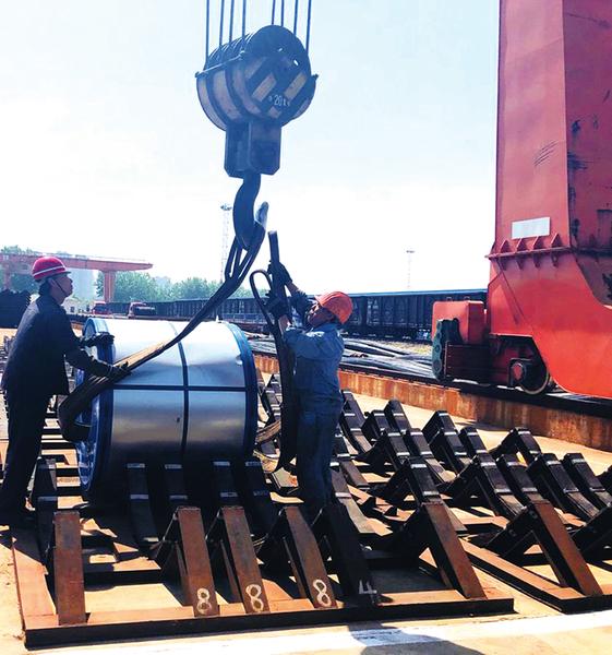 图为职工在进行卷钢装车作业。 通讯员 马双 文/摄