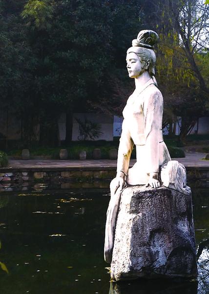 史料记载,西施是春秋时越国美女,出生于浙江诸暨苎萝山村。她天生丽质,婀娜迷人,在河边浣纱,水中的鱼被她美貌吸引,呆呆看着忘了游水,而渐渐沉于水底,这就是传说中的“沉鱼”之美。