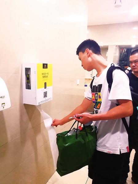 该设备以时尚、明快的黄白相间风格吸引众多旅客,旅客们纷纷拿起手机,排队体验扫码免费取纸的便利。只需将手机对准设备上的二维码扫一下,就可以免费领取5次约0.8米长的卫生纸。刚刚扫码取到纸的旅客黄先生感慨道:“这个设备的设计理念先进,能够大量减少以前浪费用纸的情况。以前在洗手间经常会看到一些不文明的人,上厕所的时候拿一长条纸,洗完手又拿一长条纸擦手,擦完还不忘带走一些。”边上的旅客也表示安装扫码取纸设备,可以有效避免这种无节制取纸的行为,符合绿色环保的要求。