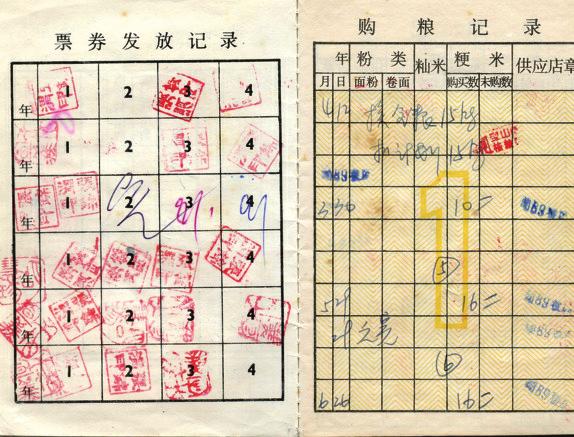 当时我家4口人,粮食定量为59公斤,每月购粮自带布口袋到指定粮店购买,可以一次购完,也可分期,但不能超计划。粮食有面粉、卷面、籼米和粳米四个品种,以籼米为主。籼米为早稻米,粳米为晚稻米,我家粳米计划为16公斤,家中有人出差要凭单位证明,调换成全国粮票,但要扣除当月相应的供应计划。各种票证每月发放一次,凭购粮证到指定粮店领取。也有的商品凭购粮证到商店剪号购买。在购粮证的最后一页内页有1至32的编号号码,职工和居民每月粮食定量有政府制定统一标准后,再有单位和粮食部门进行核准后确定。