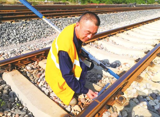 图为韦云高在检查钢轨。 (通讯员 訾庆忠 摄)