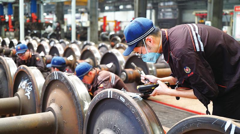 杭州北车辆段成立关键车型检修包保小组,严把X70、NX70等重载、中欧班列等关键车型的列车检修质量关,确保货物列车运行安全。图为职工仔细检测轮对。