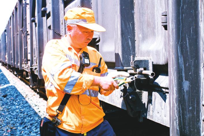 10:10,编组60辆车的26019次列车缓缓进入上发场9道,胡家顺预审完编组单后,背起工具包、拿上手持机、戴上记录仪,顶着烈日快步向列车走去,开始了他的车号货检作业。他一边用手持机核对编组单与现车信息,一边检查车门关闭、车门销进槽等情况,抽掉一辆敞车车门加固的旧铁丝,再重新捆绑上新的铁丝,细心地剪掉铁丝余尾……整个动作一气呵成。毒辣的阳光炙烤着地面的水气,在两列货车窄窄空间中升腾起蒸笼般的闷热,胡家顺的工作服已被汗水浸湿。