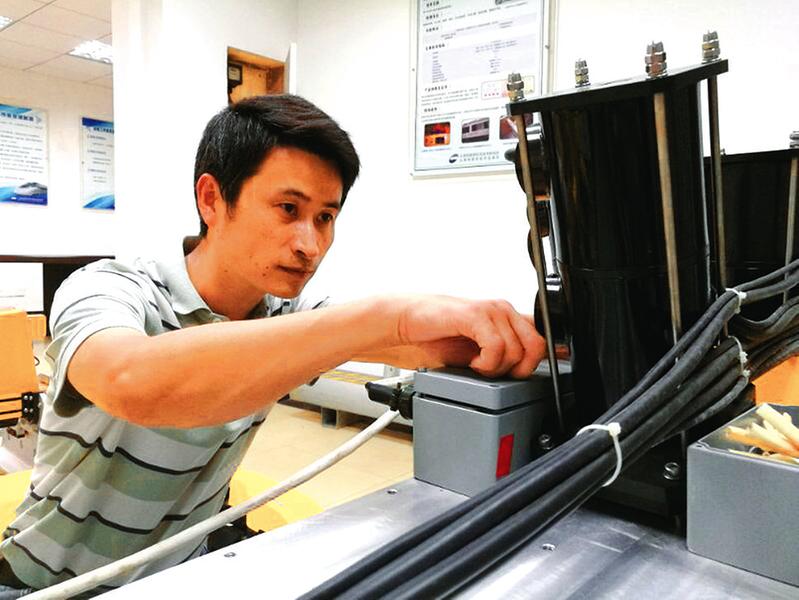 图为朱挺在调试轨道智能巡检系统设备。 记者 沈滨