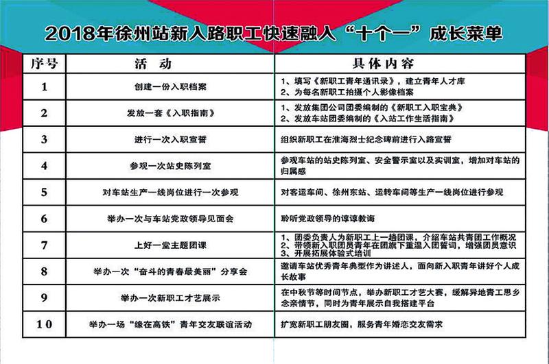 为帮助新入路职工尽快转换角色,徐州站党委制订“十个一”快速融入成长菜单,按照入路后的时间节点,为新职人员安排10项富有教育意义的活动,如拍摄个人影像视频档案、进行一次入职宣誓、参观一次站史陈列室、上好一堂主题团课、举办一次新职工才艺展示等。为缓解异地青工思乡念亲的情绪,还将在中秋节等时间节点,举办一次新职工才艺大赛、一场“缘在高铁”青年交友联谊活动,为青年展示自我搭建平台,拓宽职场朋友圈。