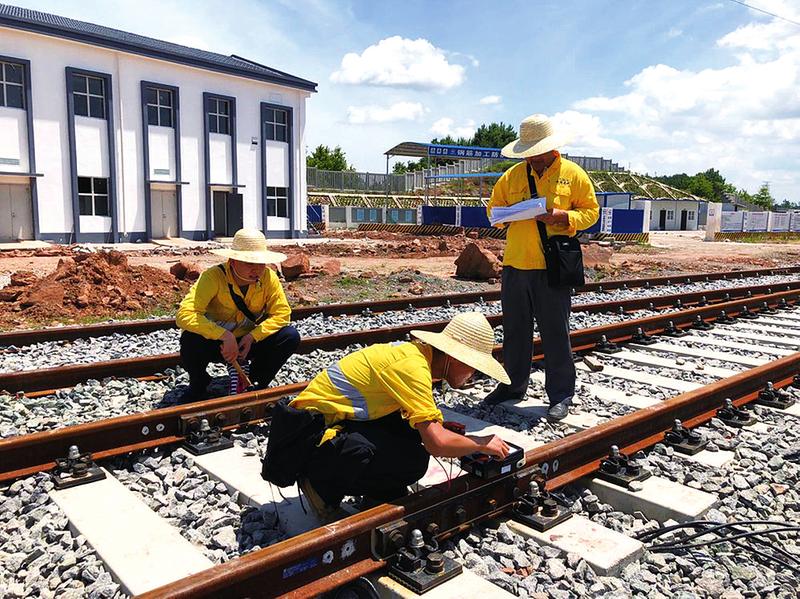 图为该段职工在杭黄高铁测量轨道电路电压数据。 (朱黎阳 摄) 通讯员 陈国庆 朱黎阳