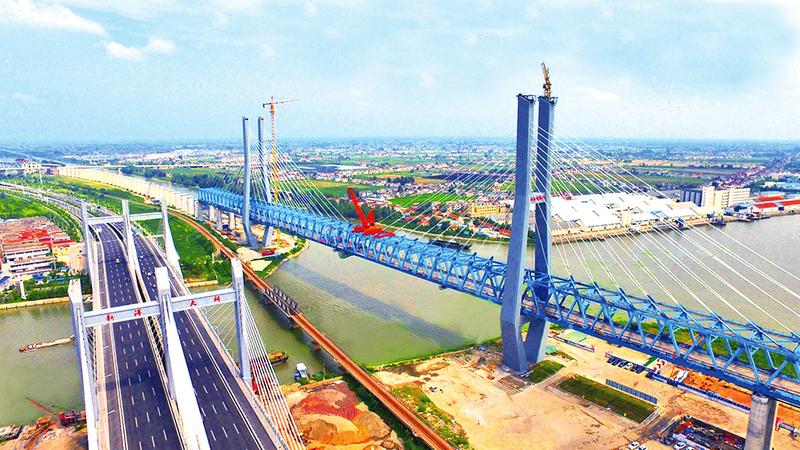 新洋港特大桥位于盐城市新洋港与通榆河交界的喇叭口处,是徐盐铁路全线、也是苏北地区跨度最大、投资最大的铁路桥梁。大桥采用连续钢桁梁斜拉桥的桥式,主桥长度650.6米,桥塔高128.5米。苏北铁路公司组织参建单位结合桥位地形特点,运用了边跨钢梁支架拼装、中跨钢梁悬臂拼装的施工方案,有效保证了桥梁结构的抗风稳定性,在施工中成功经受了九级台风的考验。