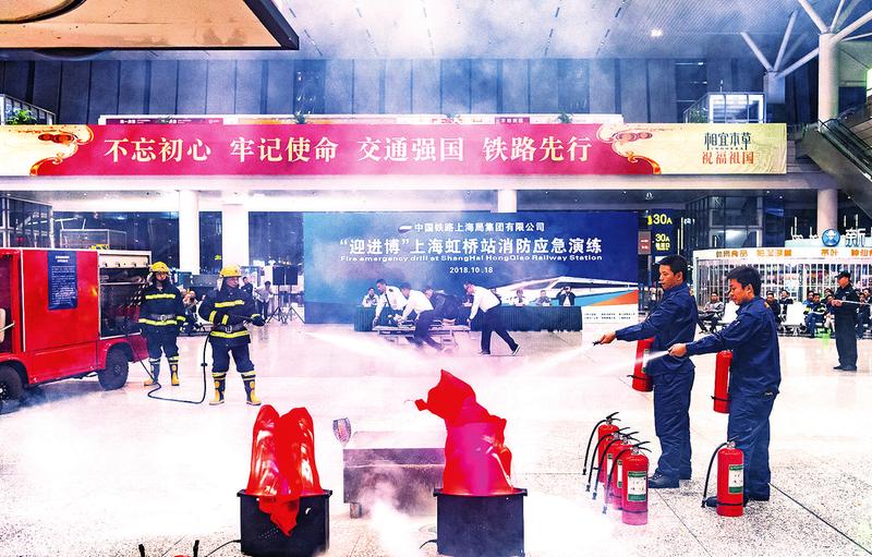 本次消防演练是集团公司应对即将到来的进口博览会大客流进行的,重点突出上海虹桥站候车区域面积大、电器设备多、客流密集、火灾防范责任重等特点,演练内容涵盖发现火情、扑灭初期火灾、启动预案、旅客疏散、救治旅客、警力增援等项目,涉及疏散、警戒、灭火、设备、通讯、救援等6个组,共70余人参与。