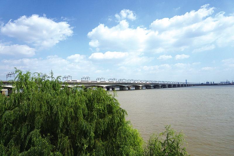 现在 随着经济飞速发展,老的钱江二桥已不能满足需求,一座钱江铁路新桥在钱江二桥边横空出世。铁路过江通道从3个增加到7个。新旧两座桥犹如双虹卧波,跨立在钱塘江之上,分别担负着普速客货列车和高速列车的过江运输使命。图为动车组列车飞驰在钱江铁路新桥上。 记者 沈滨