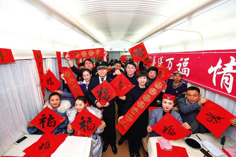 春运首日,南京客运段在G9277次复兴号列车上举办火车诗会,并邀请书法家现场泼墨,为旅客送“福”字送春联。
