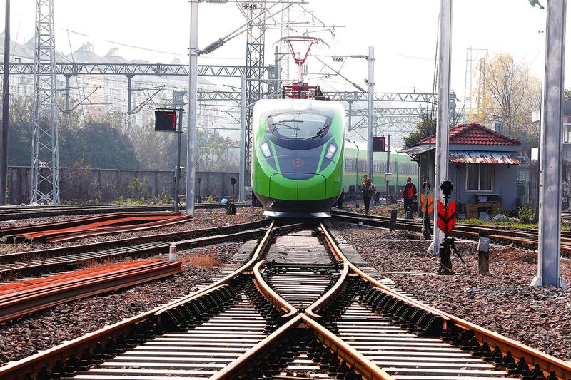 图为1月23日,被称为“绿巨人”的时速160公里动力集中动车组列车首次进入乔司直属站南星桥站进行检修。