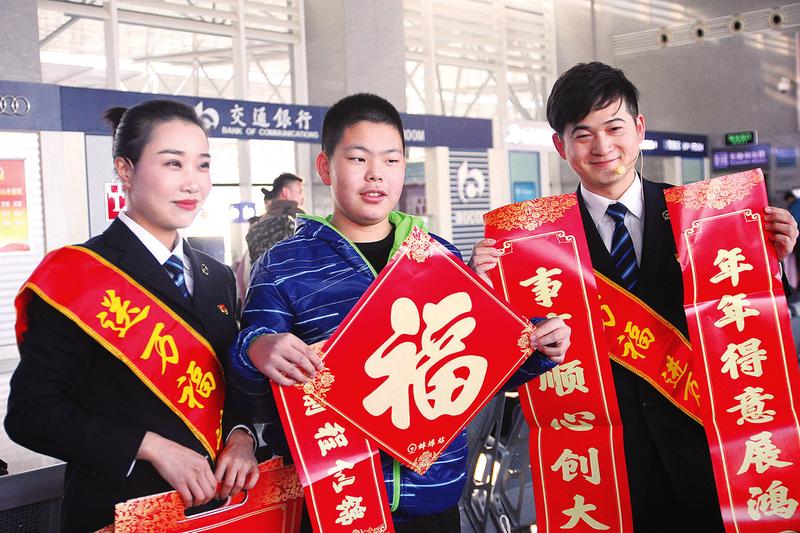 近日,蚌埠站职工为旅客送上专门定制的春联、“福”字和压岁红包袋,让广大旅客在春运旅途中就感受到蚌埠站干部职工的美好祝愿和新春祝福,感受到铁路旅行的安全、便捷与温馨。