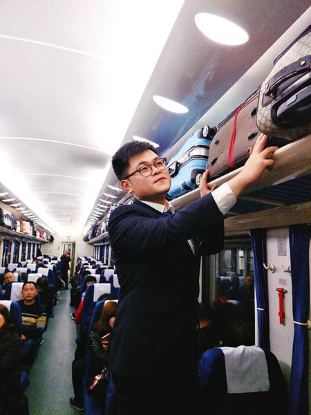 潘昕阳在家中也是父母的宝贝,但到了列车上,他很快融入环境,懂得了脚踏实地辛勤劳动。他拿起扫帚和拖把把地面拖扫干净,在旅客有困难的时候主动提供帮助。一次,一位年轻的妈妈怀中抱着婴儿到电茶炉泡面,潘昕阳看到后立即上前帮助他们,还把方便面端到了她们的座位上,旅客非常感激。旅客的声声感谢,让潘昕阳的心里暖暖的,看到自己的工作能让旅客们开开心心地回家过年,他心里充满了成就感。