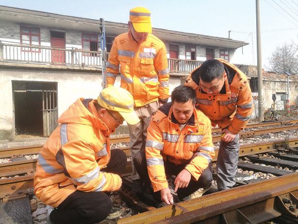 图为吴俊杰(右二)在为工区青工示范测量尖轨动程。 记者 沈滨