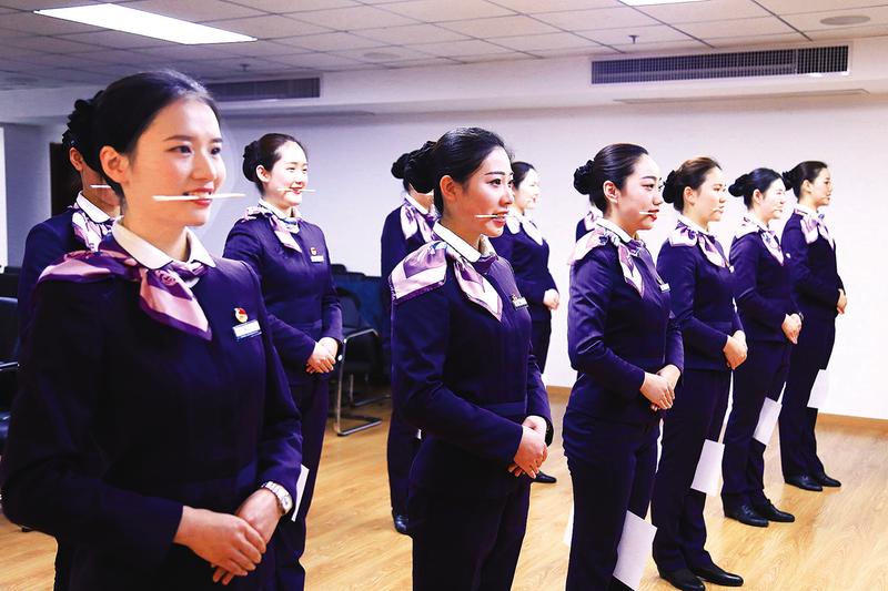 近日,为更好地服务春运,杭州客运段组织高铁乘务人员开展职业技能培训。培训内容主要包括形体训练、服务礼仪、应急演练等多个环节。图为该段乘务人员正咬筷进行微笑练习。