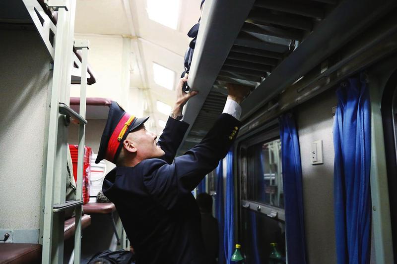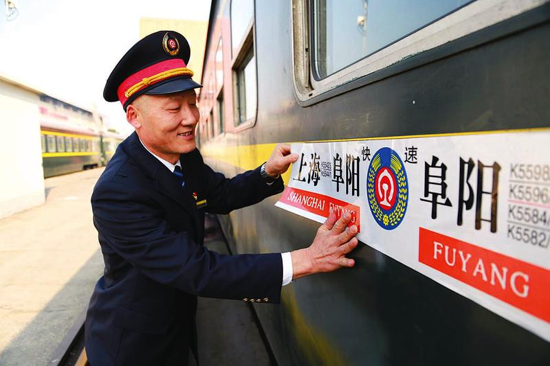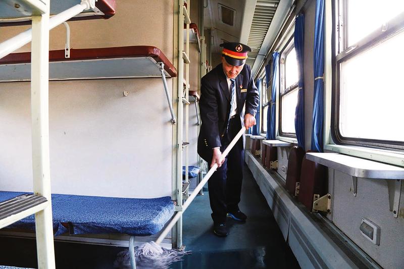 1月24日中午,在上海客技站内的K5542次列车上,合肥客运段合甬车队7组正进行出乘前的准备工作。5号车厢乘务员尹新华已经忙了一个早上,张贴区间牌、清洁车厢、擦拭玻璃、为锅炉添煤,在温暖的车厢里,看着自己的劳动成果,他露出了满意的笑容。