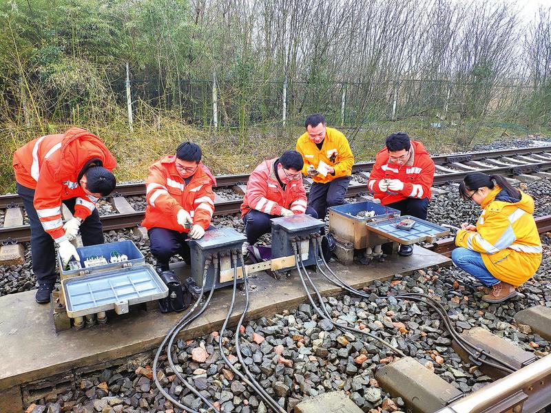 近日,为提升设备质量,合肥电务段六安车间利用天窗在六安站宁西场进行轨道电路检修作业。
