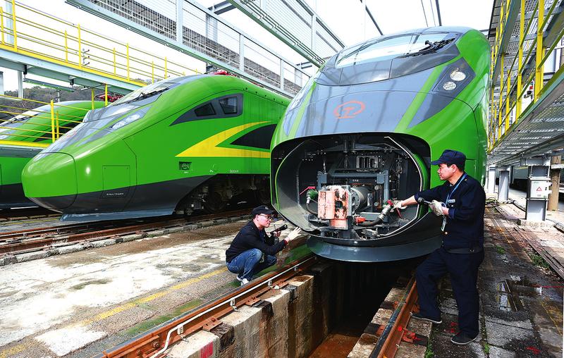 3月12日,杭州机务段职工对时速160公里复兴号集中动力动车组(CR200J)列车车头进行检修,确保列车安全运行。