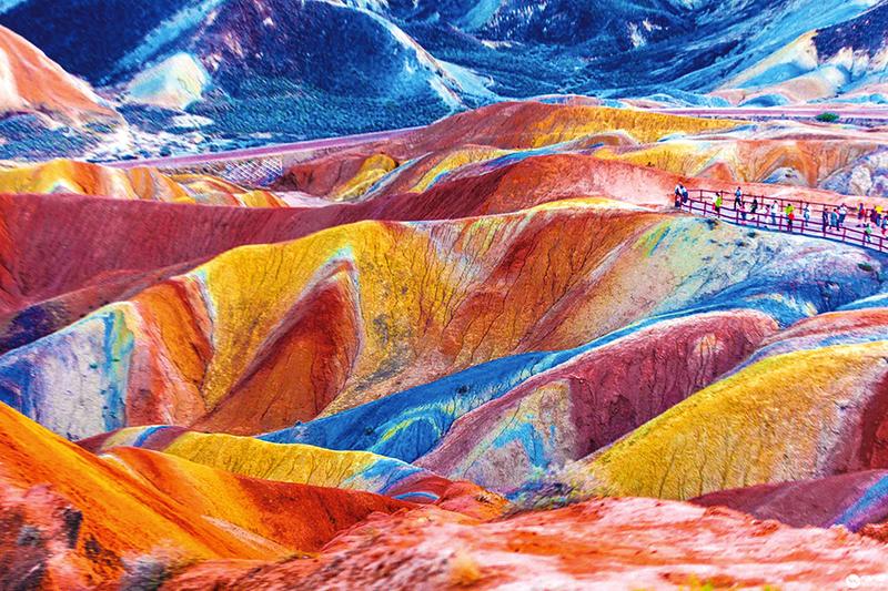 张掖的美还缘于七彩丹霞地貌,丹霞的横空出世则缘于张艺谋在此拍摄的一部电影《三枪拍案惊奇》。据专家考证,这里的丹霞地貌形成于600万年前,其地质遗迹景观造型之奇特、色彩之艳丽、规模之宏大世所罕见。张掖七彩丹霞最震撼人的便是颜色,在黄昏时间更加变幻无穷,一层黄色、一层红色再配上一层淡淡的土灰色,层次分明、线条曲折,红的如火,黄的似金,灰的如钢,颜色相配异常醒目,看后不由佩服大自然的鬼斧神工。这是浪漫的颜色,是爱情的细语,是大自然的微笑。丹霞的最佳观赏时间是清晨和傍晚,日落更佳,雨后欣赏尤为浪漫。如果前一天下过雨,早晚光线斜射,色彩会更加艳丽。