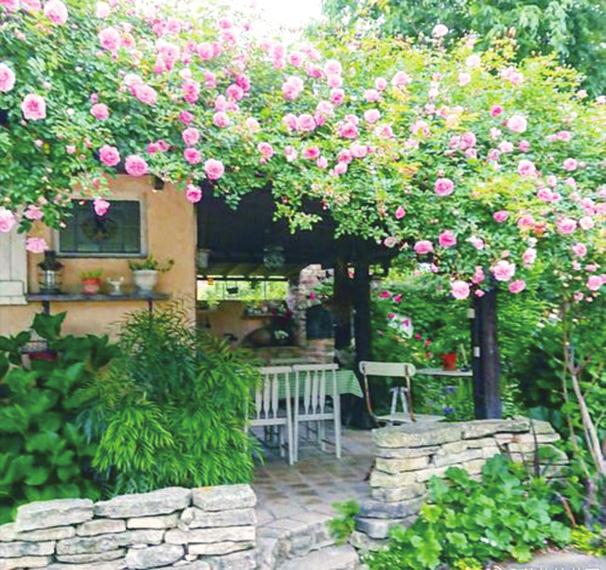 在这个阳光柔柔的初夏清晨,在静谧闲适中,我用心细嗅蔷薇,花儿开在枝间,也将一种灵动妙然之美留在我的心中。一户人家的铁栅栏上开满了繁密的蔷薇花,我看到院落中一对老夫妻静坐花下,他们品茗细语,恬适悠然,真是满架蔷薇一院香。有人说,蔷薇的花语是爱情与永恒的微笑,两位老人经过岁月沧桑一路甘苦与共的相濡以沫,就像那历经寒冬洗礼,积蓄了所有力量在这一刻妙然吐蕊的蔷薇,是盈香至骨而情暖一生的。