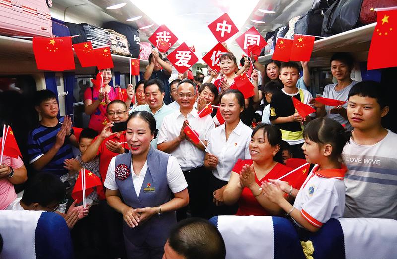 “礼赞新中国、奋进新时代”红色横幅、五星小红旗……K209次列车8号车厢内成了红色欢乐海洋。杭州客运段甬广车队党总支副书记、党的十九大代表、全国劳模陈美芳,绍兴柯桥排水有限公司高级技师、浙江省劳模、浙江工匠丁卫松,宁波公交集团驾驶员、全国劳模陈霞娜,巨化股份有限公司电化厂工艺员、全国五一劳动奖章获得者吴坚,先后为旅客作宣讲报告。陈美芳作了题为《给旅客春天般的温暖》的宣讲,向旅客们讲述自己22年来热心服务旅客的故事,用自己的成长经历诠释劳动精神和工匠品质;讲述新中国成立70年来的光辉历程和辉煌成就,宣传党的十八大以来党和国家事业发生的历史性巨变,车厢里不时爆发出了热烈掌声。劳模工匠还与旅客们现场互动演唱了歌曲《我和我的祖国》。