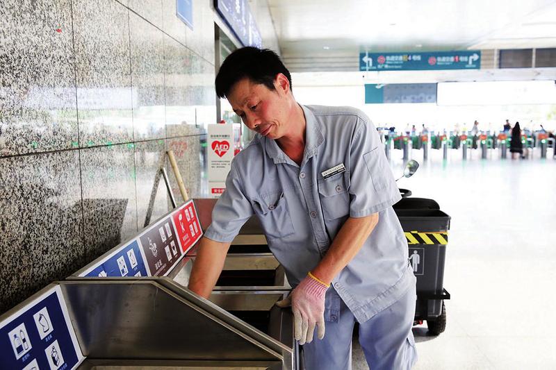 其实,王维舟的工作是非常繁重的,除了每天用各种机械清洁站台,还要负责15个垃圾桶、5只灭烟桶的动态保洁,每趟列车始发、终到后的站台随脏随扫工作,从早上6点到21点半,他一天行走的步数就达3万步以上。站台上的火车一趟接着一趟,他忙得连午饭和晚饭都是趁间隙吃的。“我觉得现在生活这么好,我也是处于干活的大好时候,我要继续在保洁员岗位上为旅客打造洁净的旅途环境。”王维舟很乐观。