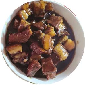 煮得上色后,可以放糖了,一是要舍得放,二是放冰糖,比例大约是一斤肉放一两糖。大火煮,翻动肉块,让每一块肉都色味均沾,待到汤水稠厚,油亮泛起,便大功告成。
