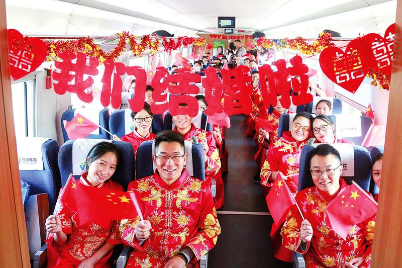 10月15日,106对新人乘坐G1619次列车,从合肥南站出发,前往黄山举行集体婚礼。他们都来自中铁四局,长期奋战在铁路建设一线。为做好服务工作,合肥客运段抽调经验丰富的列车工作人员负责新人乘坐的三节车厢,用广播为他们送上新婚祝福,为他们准备婚礼蛋糕。乘务人员还和全体新人合唱《今天你要嫁给我》,组织新人一起合影,共同分享幸福时光。