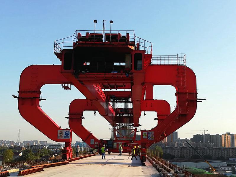 那是十月的一天下午,3点多钟,我们从黄山北站驱车赶到位于宣城市区北面,夹在敬亭山风景区东麓与水阳江西岸之间,紧挨着南北走向的芜广铁路既有线的该高铁建设工地。高架桥上一孔新梁刚架设完约刻把钟,鲜红高大威武的架梁机,长约三四十米、高十五六米、宽有二十来米,张着4只巨大的爪螯,已停机静静地卧在刚架设的梁板上,四五名工人正往两边的防护墙上浇筑水泥。中等个、年近50岁的制梁厂厂长吴潮已在那儿等候多时了。他说当天还需铺架的最后一片900吨整体梁,已从北面4公里外松泉东路附近的梁场装车了,不用半小时就将运抵这里。