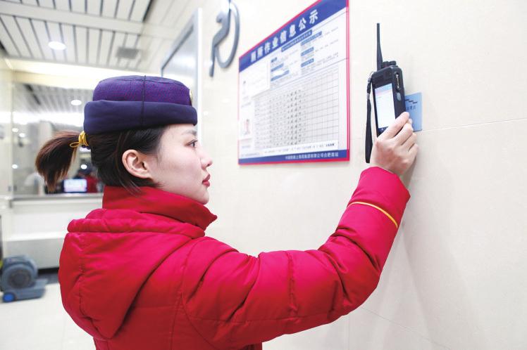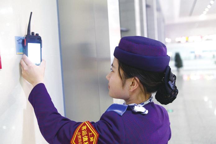 图为合肥南站职工用客运网络巡更仪在车站不同区域打卡