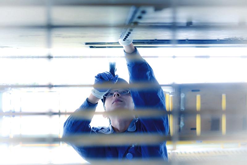 动车组缓缓开进工作台,动车组机械师首先开始预检。之后,动车组地坑式架车机启动,稳稳地把整列动车组举起。机械师们随后井然有序地工作,转向架拆卸分解清洗打磨,裙板拆卸,设备舱清理等。重新安装好零配件后动车组焕然一新。