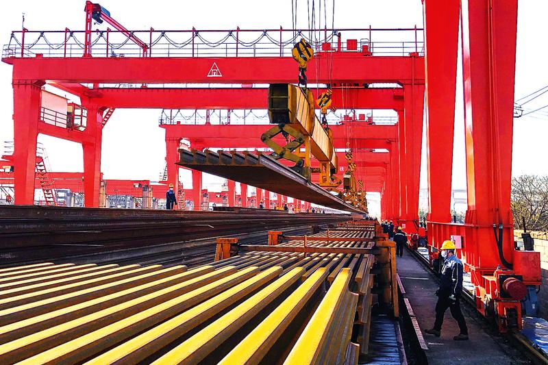 2月17日,经过芜湖市防疫部门批准,上海工务大修段芜湖北焊轨基地开始分批复工复产,在疫情防控的同时,做好长钢轨焊接生产,确保完成高铁建设的供轨工作。图为该段基地装卸工班职工在吊装长钢轨。