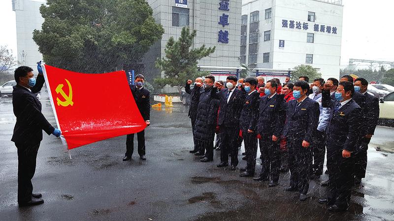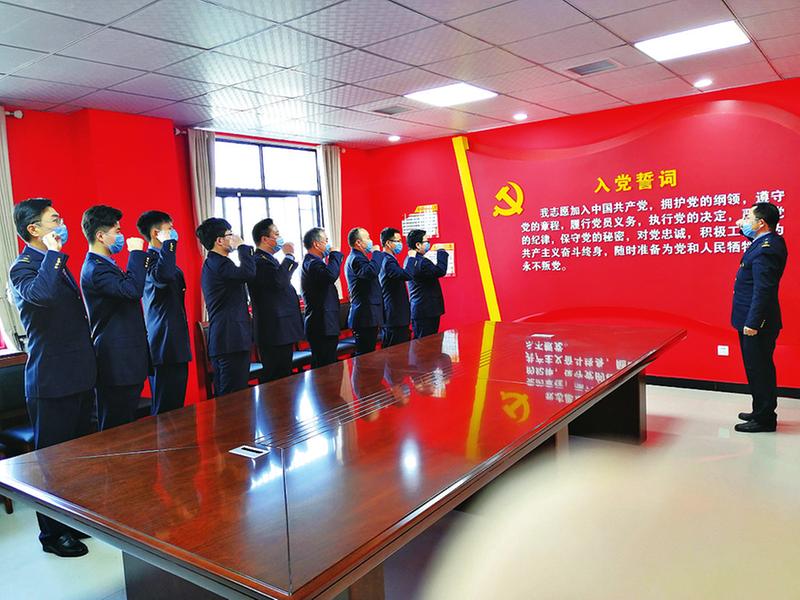 阜阳北站上行场车间党总支组织党员面向党旗宣誓,迎难而上,坚决打赢疫情防控阻击战。张梦辰/供图