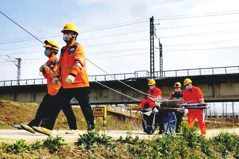 合肥供电段阜南供电工区为做好疫情期间的供电设备纠缺工作,对汽车难以到达的作业点,采取走小路、手拉肩扛和小车推拉的方式,把安全用具和材料运到离作业点最近的地方,以保证疫情防控和设备纠缺“两不误”。 武月亮/图