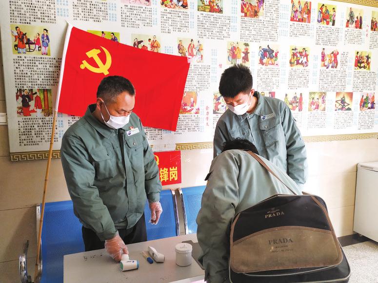 合肥机务段党员突击队人员在给退勤乘务员测体温。王道强/图
