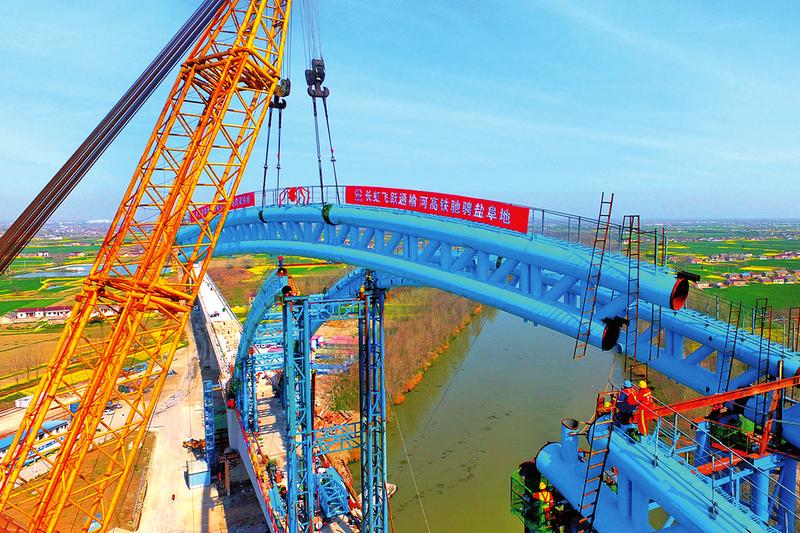 3月23日,盐通铁路全线最大控制性工程跨通榆河特大桥主桥跨度228米的连续梁拱桥顺利合龙。跨通榆河特大桥主桥连续梁全长451米,是全国在建时速350公里高铁跨度最大的连续梁拱桥。