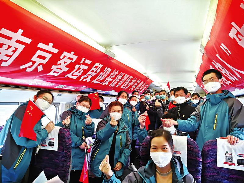 图①:南京客运段乘务员与医护人员互动。
