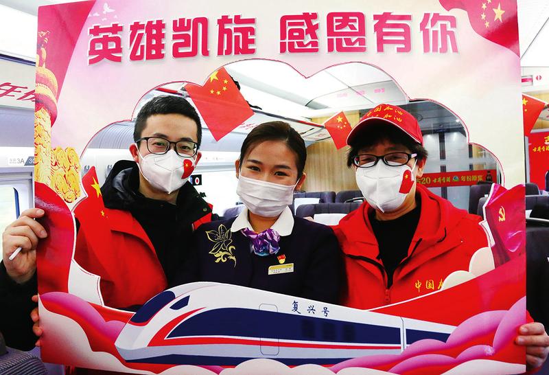 图③:合肥客运段乘务员与医护人员同框合影。 3月23日、24日,由南京客运段担当乘务的D3074次列车,分别运送江苏、安徽援鄂医疗团队84人从汉口站返回南京南站、合肥南站。3月24日,由合肥客运段担当乘务的G649次列车,从武汉站运送湖南养老服务援鄂工作队医疗队员34人返回长沙南站。工作人员精心布置车厢、站台场景,协助搬运行李物资,做好站车服务,为他们送上铁路纪念品,向抗疫英雄们致以崇高敬意。