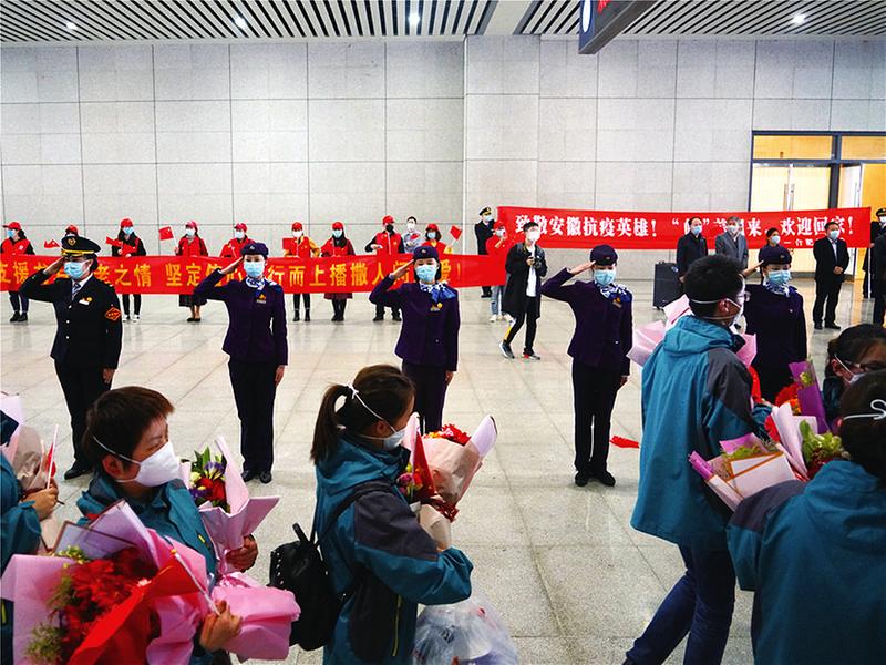 图②:合肥站工作人员向医护人员敬礼致敬。