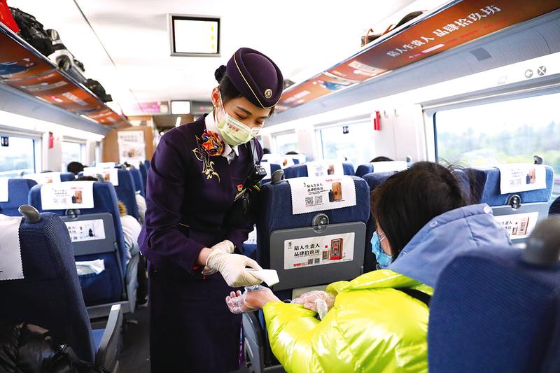 2月27日,G9401次列车长祁琪与往常一样,在班组出乘前对乘务人员的体温进行测量,并关照他们佩戴口罩、手套,互相检查各自防护用品的携带情况。