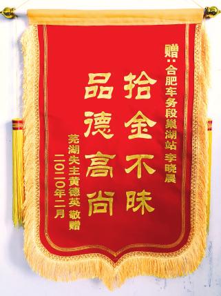3月15日,巢湖站收到一件快递,是一面锦旗和一封感谢信,锦旗上印着“拾金不昧,品德高尚”,注明赠予合肥车务段巢湖站客运值班员李晓晨。