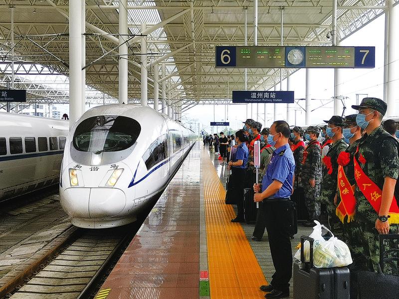 近期,集团公司启动新老兵运输工作,各单位积极对接地方部门,安排精干力量,加强新老兵乘降组织,确保新老兵运输平稳有序。图为9月11日,宁波车务段温州南站客运职工引导新兵按车厢号有序上车。