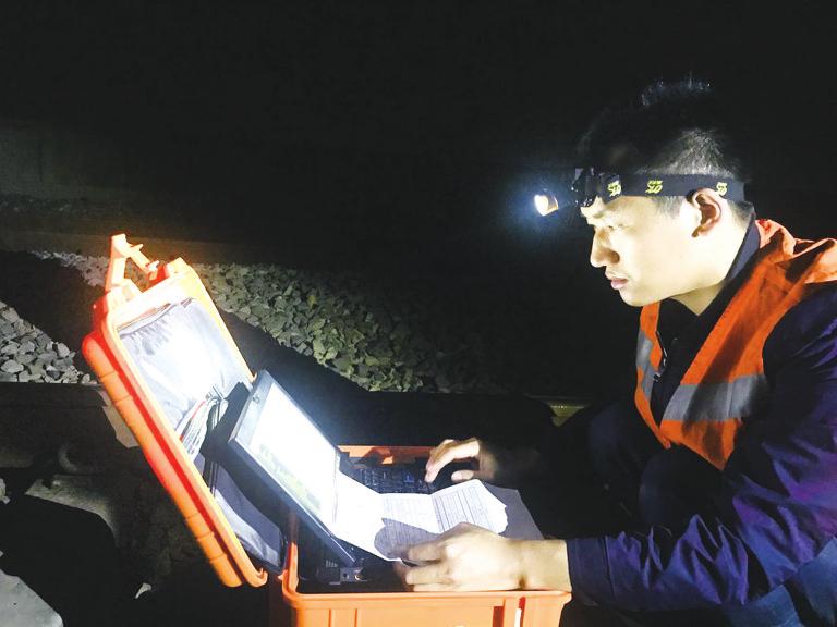 图为董才梁在台州南站测试应答器。 通讯员 俞叶 文/摄