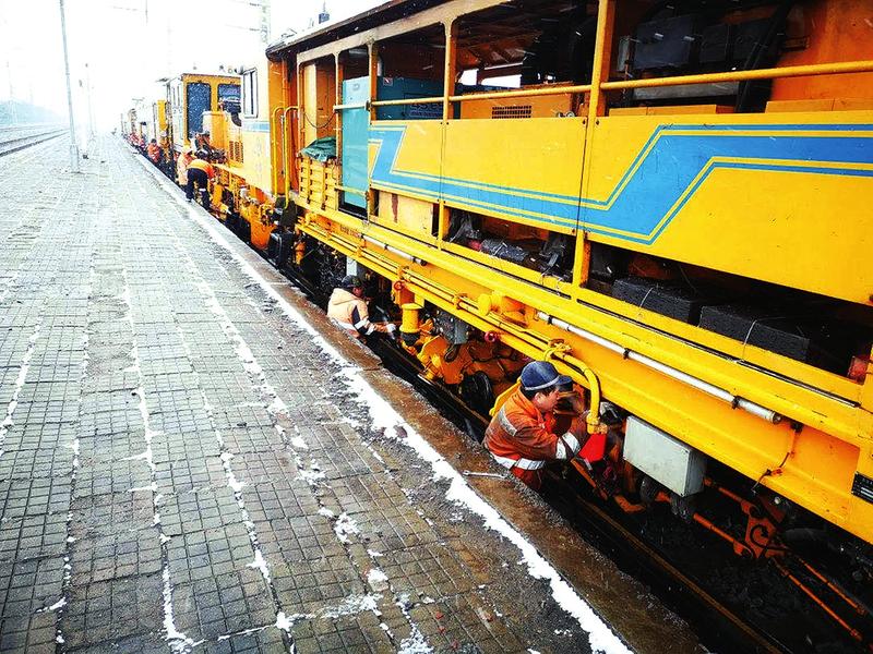 图②:上海大型养路机械运用检修段职工正在对设备进行防寒保养。(通讯员 唐红平 摄)
