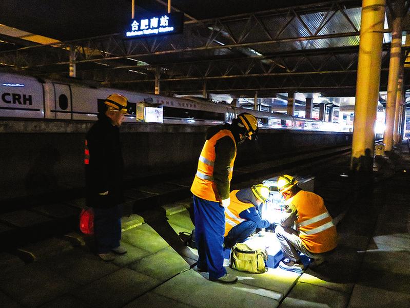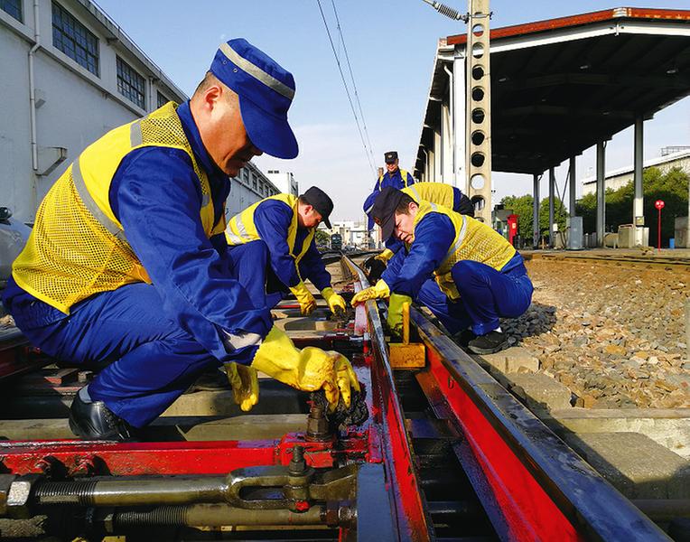 图①:上海机辆段职工在清扫库内道岔。(通讯员 许广民 摄)
