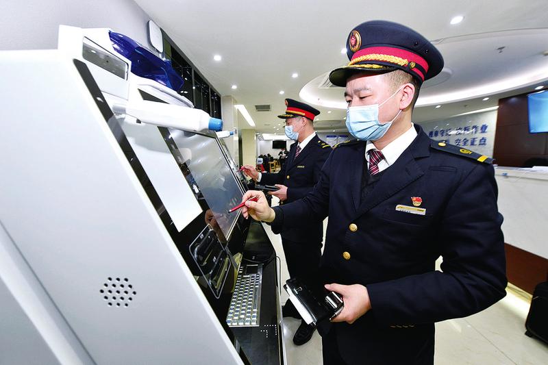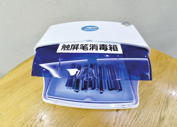 图②触屏笔消毒箱。 本报讯(通讯员 姚明亮 梁东 摄影报道)手指靠近箱子,箱盖自动打开,取出消过毒的触屏笔办理出退勤手续,既安全又快捷。1月30日,在合肥机务段动车运用车间合肥南派班室里,前来出勤的动车组司机们发现,自助出退勤机上有台感应式紫外线触屏笔消毒箱。这是该段“戴建军技能大师工作室”新研制的防疫“神器”。