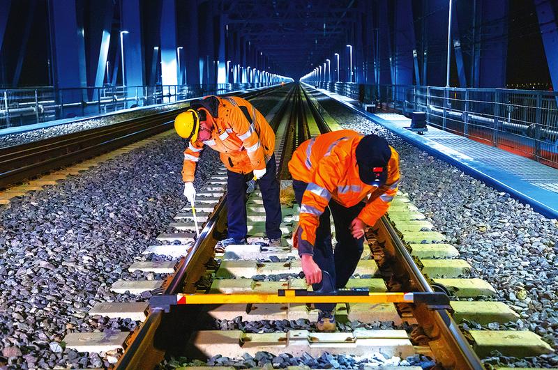 为确保沪苏通长江大桥在首个春运中安全,上海工务段组织职工对大桥上的轨道线路、桥涵设施开展全方位昼夜巡检。图为该段张家港高铁线桥车间职工在大桥铁路面检查线路几何状态。