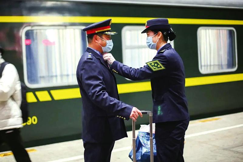 临近大年三十,返乡客流有所增加,马艳值乘的进京列车T36次正好停靠蚌埠站,邵强结束了从阜阳到北京的临客乘务工作回到蚌埠,还没来得及回家换制服就急忙来到站台上见马艳一面,并送上水果。“儿子最近学习压力大,你回家多陪陪他;爸最近身体有点不舒服,你勤去看一下。饺子我已包好放在冰箱冷冻了,你回去下了和儿子一起吃。”马艳的话刚说完,邵强接口道:“近期疫情防控形势严峻,工作细心一点,保护好自己,巡视车厢时戴好口罩。”两人短短的5分钟“约会”,透着幸福和甜蜜。