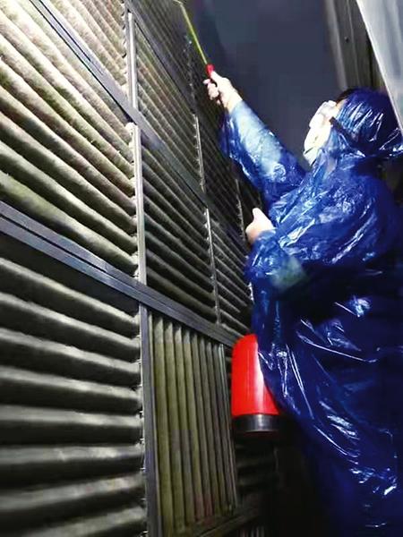 车站虽停止办客,但是黄鼎和他的团队却更加忙碌。车站的空调作为循环系统,是防止病毒扩散的重点部位。天气炎热,空调既要开得舒适,又要开得安全。黄鼎和他的“战友”们每天背着又重又呛人的消毒水,在昏暗、闷热、潮湿的空调机箱里一遍遍地给空调过滤网喷洒消毒水(见图)。“特殊时期,关键点一定要把控好,确保车站的空气洁净。”每次从空调机箱里完成消毒走出来,黄鼎他们全身都已经湿透。