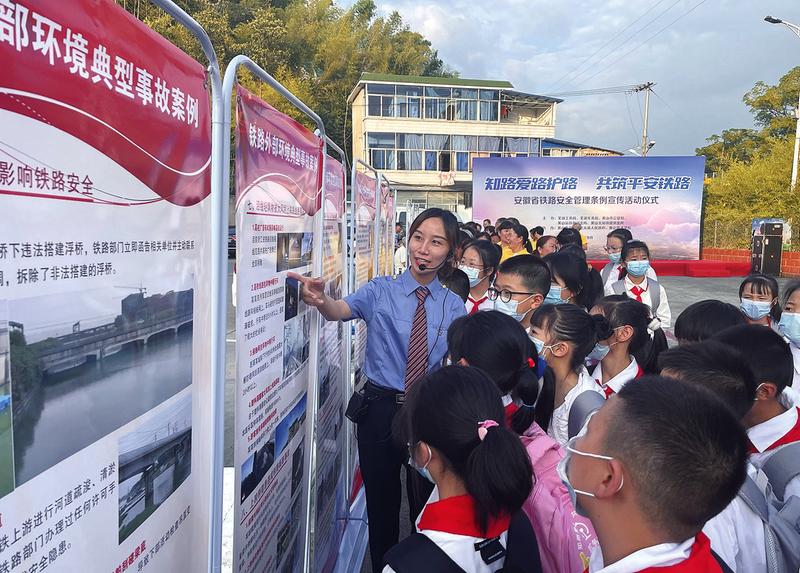 近日,芜湖工务段采取现场解读展板内容、观看警示教育片、面对面宣传等方式,组织职工开展“知路爱路护路,共筑平安铁路”暨安徽省铁路安全管理条例宣传活动,提高铁路沿线居民爱路护路意识。图为该段职工在为小学生讲解铁路安全知识。
